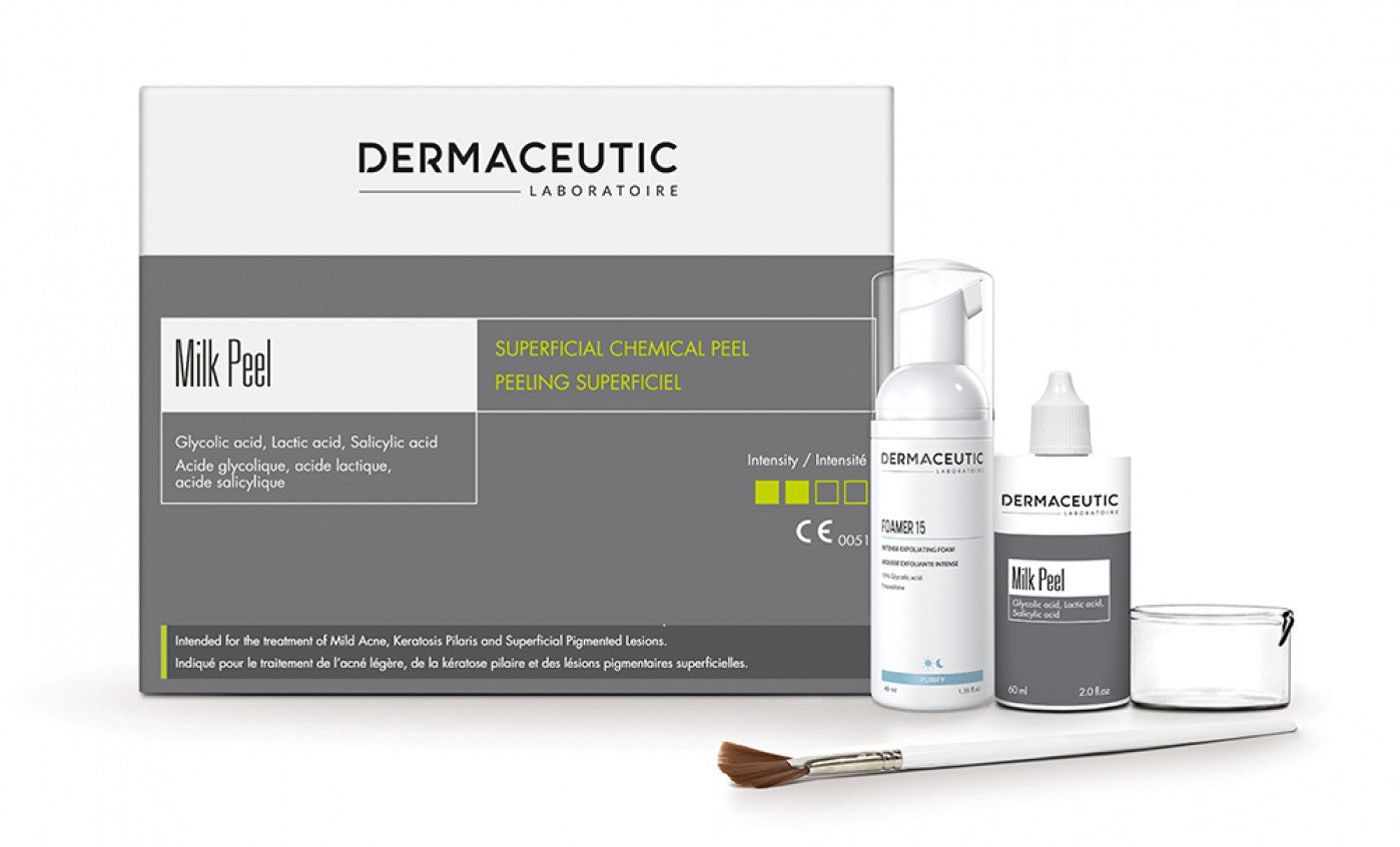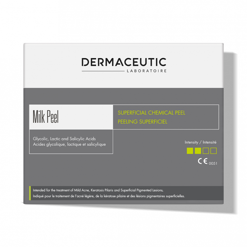 Dermaceutic Milk Peel is intended for the treatment of mild acne, keratosis pilaris and superficial pigmented lesions. Suitable for all skin types and phototypes.